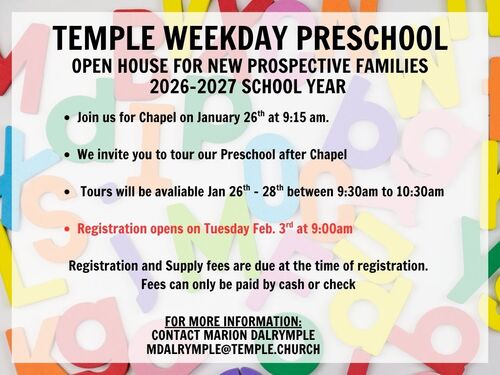 Temple Weekday Preschool is a ministry of Temple Church. It was founded to provide a caring environment for preschool children where they can experience God's love.